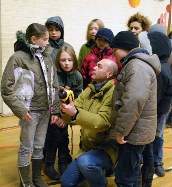 Die Umweltgruppe der Schule am Falkplatz nutzte die Chance zusammen mit ihrer Lehrerin Ingrid Temme zu einer Aufnahme des fast 100 Jahre alten Gebäudes mit seinen zahlreichen schlecht dichtenden alten Fenstern; auch Hausmeister Norbert Ackermann war mit dabei; jetzt soll untersucht werden, warum bestimmte Fenster besonders undicht zu sein scheinen.