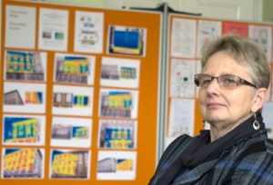 Diese Bilder fielen auch der Bezirksstadträtin für Gesundheit, Soziales, Schule und Sport, Lioba Zürn-Kasztantowicz (Bild), gleich ins Auge. Die Stadträtin war gekommen, um die Mitarbeit der Schule im Pankower Projekt „Köpfchen statt Kohle“ zu loben. Doch begann sie angesichts der Wärmebilder-Ausstellung erst mit einer Frage: „Was ist denn besser, blau oder rot?“ Die Schülerinnen und Schüler der Umweltgruppe mussten um die Antwort nicht verlegen sein und klärten die Stadträtin über die Bedeutung der Farbskalen auf. Über vielen gelb-roten Flächen verliert das Schulgebäude im Winter wertvolle Heizenergie. Und dort wo die rote Farbe in ein klares Weiß übergeht, strömt die warme Luft regelrecht ins Freie. Das Hauptproblem der Schule sind die alten und vielfach auch am Rahmen undichten Einfachfenster. „Wir haben an unserer Schule 403 Fenster“, berichtete Ingrid Temme, die als Lehrkraft die Umweltgruppe betreut. Auch dass bis zu 10 mm breite Spalten zwischen Fenster und Rahmen klaffen, hat die Umweltgruppe minutiös nachgemessen. In einer EXCEL-Tabelle zeigten sie, dass solche Spalten Temperaturverluste bis zu 11 Grad Celsius verursachen.