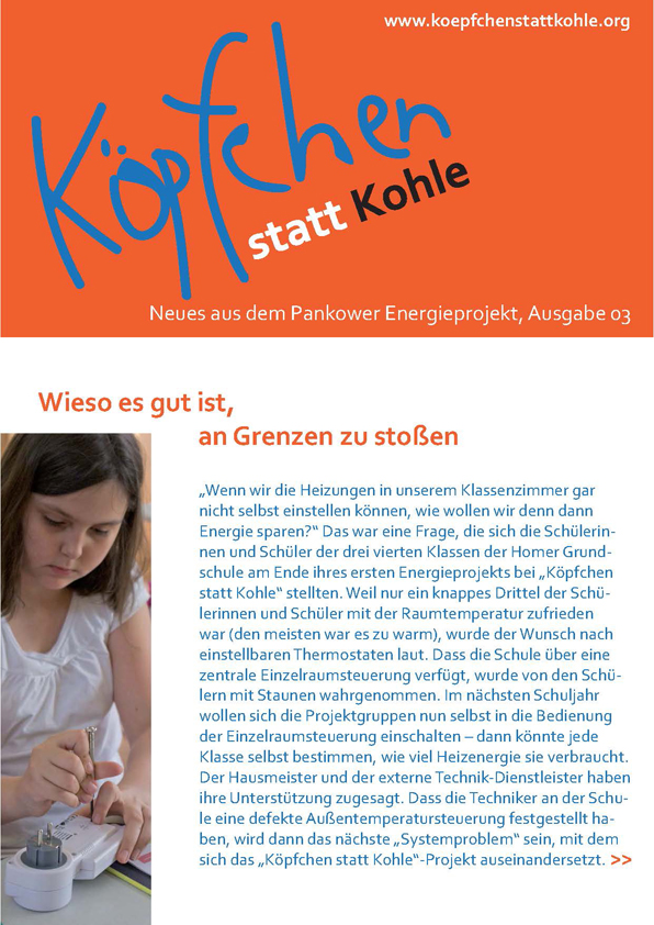 Der aktuelle Projektbrief enthält eine Übersicht der bisherigen Aktivitäten, berichtet über den konstruktiven Umgang mit den Grenzen, an die die Schulprojekte auch immer wieder stoßen, und stellt die Firma Sauter FM als den technischen Dienstleistungspartner von „Köpfchen statt Kohle“ vor.