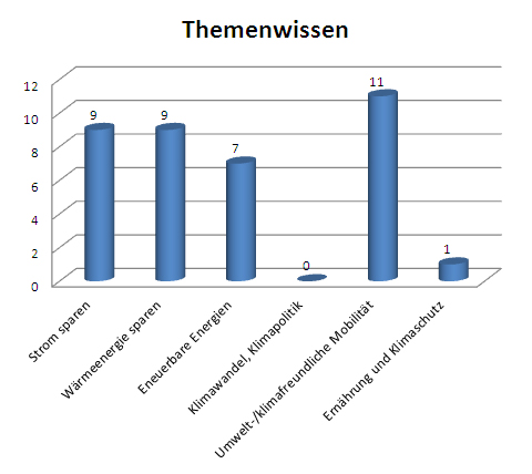 Das Energiethema wird im Zusammenhang mit dem bevorstehenden Projekt in erster Linie unter dem Aspekt des praktischen Handelns gesehen. Wissenserwerb und Situationsanalyse erscheinen demgegenüber zunächst zweitrangig. Nur 23% der befragten Schülerinnen und Schüler halten eine vorausgehende Situationsanalyse für besonders wichtig. Nur 7% nennen Wissensaspekte bei den primären Zielen des Projekts. Zu Wissensaspekten zählten im Fragebogen die Punkte „Messmethoden kennenlernen“, „Professionelles Herangehen lernen“, „Neues kennen lernen“ und „Sach- und Technikwissen erwerben“. Auch das Wissen zum Thema „Energie“, das die Schüler(innen) bereits mitbringen, liegt vor allem in praktischen Bereichen. 49% geben an, über Energieeinsparung bereits mehr zu wissen, während das Verständnis über die Zusammenhänge des Klimawandels oder die Beziehung zwischen Ernährung und Klimaschutz so gut wie keine Rolle spielen. Überraschend hoch fällt das Wissen über umwelt- und klimafreundliche Mobilität (30% der Antworten) aus.