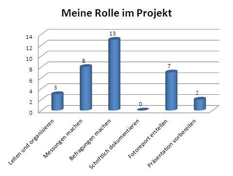 Auch wenn man die Antworten auf die Frage nach den Lieblingsaufgaben im Projekt auswertet, fällt auf, dass die soziale Seite des Aufgabenspektrums favorisiert wird. Mit 39% schneidet der Punkt „Fragebogen-Umfragen machen und auswerten“ am höchsten ab, erst danach kommt der technische Aspekt „Messungen machen und auswerten“ (24%). Fast ebenso oft wird die Antwort „Einen Fotoreport über das Projekt erstellen“ (21%) gegeben, wohingegen kein einziges Mal „Das Projekt schriftlich dokumentieren“ angekreuzt wird. In eine Führungsrolle im Projekt wollen 3 der 22 Schüler(innen) gehen.