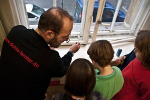 Am 12.12.2011 nahm die Energiespargruppe an einem Ortstermin in Raum 006 der Schule zusammen mit dem Spezialisten für Fensterabdichtung Eduard Götz (www.dichte-fenster.de) teil, um die geeignete Abdichtungstechnik zu klären. Götz hat in den letzten beiden Tagen diesen Raum kostenlos an allen Fenstern fachmännisch abgedichtet, um eine Überprüfung des Dämmungseffekts zu ermöglichen. Diese Überprüfung erfolgt mit Unterstützung der Firma Sauter FM, die die Messgeräte dafür zur Verfügung stellt, in den nächsten zwei Wochen. Das erlaubt eine Berechnung der Einsparung an Energie(kosten) sowie der Verringerung des CO2-Ausstoßes.