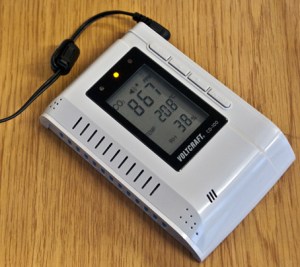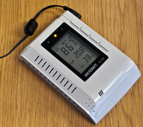 Um das heraus zu finden, setzte eine Schülergruppe das CO2-Messgerät CO-100 von Voltcraft (Foto) ein. Dieses Gerät erfasst das Kohlendioxid in der Luft und hat auch eine optische Warnanzeige. Bis 800 ppm CO2 leuchtet sie grün, zwischen 800 und 1200 ppm gelb und ab 1200 ppm rot. Diese Einteilung entspricht den Richtwerten, wie sie für Büros und Klassenräume gelten. Schon nach einer halben Stunde waren im Klassenraum Werte von deutlich über 2000 ppm erreicht, das rote Licht leuchtete. Das blieb auch so, obwohl einige der kleinen Kippfenster die ganze Zeit über offen waren. Anscheinend wurde durch die Kippfenster zwar Wärme aus dem Raum transportiert, aber nicht genügend Luft ausgetauscht, um gute CO2-Werte zu erreichen.