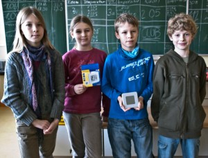 Die 5b wollte es wissen: Für kurze zweieinhalb Minuten wurden statt der Kippfenster alle großen Fenster weit geöffnet – und auch die gegenüberliegende Tür zum Flur. Tatsächlich leuchtete danach die Lampe am CO2-Messgerät grün. Die Temperatur im Raum war zwar auf 18 bis 19 Grad gesunken, aber sie stieg rasch wieder nach dem Schließen von Tür und Fenstern. Dieser Selbstversuch überzeugte die Klasse so, dass anschließend gleich ein Viererteam (Foto) gebildet wurde, das bis zum Ende der Heizperiode das richtige Lüften in der Klasse übernimmt.