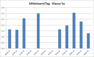 Nach Ende des vierwöchigen Projekts in den fünften Klassen hinterließen die Betreuer in jeder Klasse ein Raumthermometer und Protokollblätter, auf denen weiterhin die Temperaturen in ihren Klassenräumen eingetragen und wöchentlich an die Betreuer gefaxt werden sollten. Die jeweils eine Woche lang dafür verantwortlichen Schülerinnen und Schüler werden mit einem Poster im Klassenraum an ihre Aufgabe erinnert. Die Projektbetreuer von stratum schicken den Klassen auf Grund der Messdaten eine Auswertung zusammen mit Fragen und Anregungen zurück. Ein Diagramm (siehe Bild oben) zeigt, wie weit die Durchschnittstemperaturen im Klassenraum über 20°C gelegen haben. Das Ziel ist, möglichst bald die 20 °C dauerhaft zu erreichen – und zwar ohne energieverschwendendes Dauerlüften.