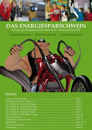 Große Pläne für das kommende Schuljahr hat auch die Klasse 5b der Schule am Hohen Feld. Die Schülerinnen und Schüler wollen das Wissen und die Erfahrung, die sie über vier Monate hinweg im „Köpfchen statt Kohle“-Projekt gesammelt haben, für die Weiterarbeit nutzen. Schließlich haben sie Ideen, wie man an der ganzen Schule Heizenergie sparen kann. „Die Thermostateinstellung auf ‚1‘ reicht völlig aus und sollte der Normalfall sein“, sind sich die Schüler der 5b einig. Im kommenden Schuljahr wollen sie in allen Klassen für Mitarbeit an dem großen Experiment werben. Mit Messgeräten und durch Befragungen und Beobachtungen wollen sie prüfen, ob ihre Empfehlung befolgt wird und ob die niedrige Thermostateinstellung tatsächlich ausreicht. „Das geht natürlich nicht ohne richtiges Lüften“, stellen Hendrik, Steven, Fabian, Camillo und Robert fest, die in den letzten Monaten mit einem CO2-Messgerät experimentiert haben, um die Abhängigkeit der Luftqualität von den Raumtemperaturen zu erforschen. Sie schlagen vor, dass in allen Klassen künftig Luftgüteampeln, die den CO2-Wert messen, aufgestellt werden, um die Klassen zum richtigen Lüften zu motivieren. Um jetzt schon die Schüler und Lehrer ihrer Schule auf das Kommende vorzubereiten, hat die 5b eine 16-seitige Zeitung über das Energieprojekt geschrieben und selbst gestaltet (siehe Coverfoto oben). Aus „Köpfchen statt Kohle“-Mitteln wurde die Zeitung gedruckt. Sie wird noch vor den Osterferien an alle Schüler und Lehrer verteilt.