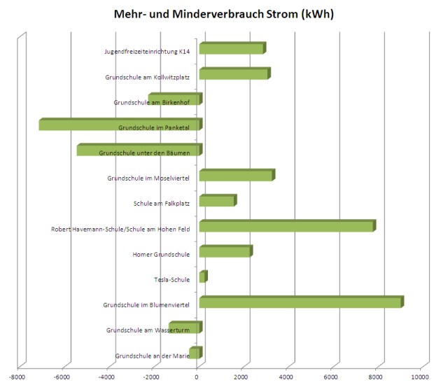 Erstmals liegt jetzt auch die Verbrauchsstatistik für den Stromverbrauch der Schulen vor, die bei „Köpfchen statt Kohle“ mitmachen. Die Grafik unten zeigt, dass wie auch bei der Heizenergie manche Schulen im Vergleich der Jahre 2010 und 2011 mehr und manche weniger Strom verbraucht haben. Woran das liegt, kann nur im Einzelfall geklärt werden. Eine generelle deutliche Zunahme des Stromverbrauchs lässt sich nicht feststellen, wenngleich einzelne Schulen wie die Grundschule im Blumenviertel und die Robert Havemann-Schule deutliche Steigerungen zu verzeichnen haben. Auch die Grundschulen im Moselviertel und am Kollwitzplatz haben 2011 höhere Stromrechnungen an den Bezirk geschickt. Fünftklässler der Kollwitzplatz-Schule haben jetzt errechnet, dass durch verschiedene Maßnahmen vor allem bei der Schul-EDV ungefähr 1.800 Euro pro Jahr gespart werden könnten, das sind immerhin 14 % der jährlichen Stromkosten.