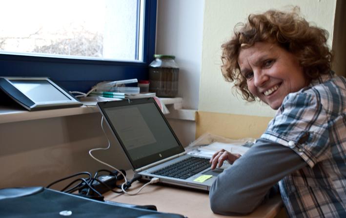 Die meisten „Köpfchen statt Kohle“-Projekte finden im Winterhalbjahr statt, weil Heizenergie- und Stromverbrauch dann am höchsten sind. Die Grundschule im Blumenviertel hat sich jedoch Gedanken gemacht, wie Energie- und Klimathemen auch im Sommerhalbjahr platziert werden können. Irmtraud Pelzl, die als Lehrkraft auch die Naturwissenschaft an der Schule verantwortet, möchte gerne die Schulwegmobilität im Rahmen von „Köpfchen statt Kohle“ untersuchen. Falls sich eine interessierte Schülergruppe findet, wird nach den Osterferien eine große Befragung darüber stattfinden, wie die Schüler zur Schule kommen – zu Fuß, mit dem Fahrrad, dem ÖPNV oder mit dem Auto. Aus den Ergebnissen soll der mobile CO2-Fußabdruck der Schule errechnet werden und sollen Vorschläge entwickelt werden, um die Schulwege der Blumenviertel-Schüler noch klimafreundlicher zu machen. Falls sich aber jetzt keine interessierte Schülergruppe findet, die das Projekt – unterstützt durch die „Köpfchen statt Kohle“-Coaches – anpacken möchte, soll es zu Schuljahresbeginn im Rahmen des Mathematik-Unterrichts gestartet werden, wenn statistische Erhebungen und Auswertungen auf dem Lehrplan stehen. Auch Heizenergie könnte im kommenden Schuljahr wieder zum Thema werden. Zwar sind die im letzten Schuljahr bereits aufgedeckten Probleme in der Turnhalle nur zum kleineren Teil gelöst worden – ein überdimensionierter Warmwassertank ging glücklicherweise kaputt und wurde durch neue energieeffiziente Technik ersetzt, aber die Heizungsregelung der Turnhalle ist nach wie vor defekt und lässt weder einen energiesparenden Betrieb noch ein angenehmes Arbeitsklima für Lehrkräfte und Schüler zu. Aber die Schule hat eine von PCE gesponserte Wetterstation eingerichtet, die bei den Schülern sehr viel Interesse findet. Im Winterhalbjahr könnte man damit z.B. für die Schule eine genaue Heizbedarfsanalyse erstellen und den Zusammenhang von Außen- und Innenraumtemperatur untersuchen. Unser Foto (oben) zeigt Irmtraud Pelzl am Empfangsgerät der Wetterstation, das mit einem Computer verbunden eine laufende Aufzeichnung von Klimadaten ermöglicht.