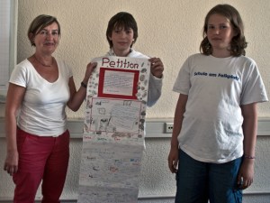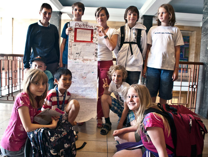Am vorletzten Schultag wollte die Energie-Projektgruppe der Schule am Falkplatz noch etwas tun, um das kommende Schuljahr vorzubereiten. Weil die Schüler herausgefunden hatten, wie viel Heizenergie durch die extrem undichten Fenster ihrer Schule entweicht und jedes Jahr nur durch die Fensterfugen mindestens 22 Tonnen CO2 mehr in die Luft gepustet werden als nötig, haben sie einen Abhilfevorschlag entwickelt. Damit dieser Vorschlag auch noch vor der nächsten Heizperiode umgesetzt wird, meldeten sie sich mit einer ausführlichen „Petition“ vor den Sommerferien bei der zuständigen Bezirksstadträtin, Christine Keil, zu einem Termin im Pankower Rathaus in Weißensee an (Foto oben).