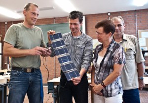 Um den nötigen Erfahrungshintergrund aufzubauen und auch die Arbeitslehre-Lehrkräfte im Umgang mit der Praxis der Solartechnik vertraut zu machen (auf unserem Foto mit dabei ist Heidrun Fritzenwanker neben Werkstattleiter Norbert Hansen), könnten in einem Physik-Wahlpflichtkurs verschiedene Ladegeräte mit Solarzellen gebaut und getestet und die Möglichkeiten der elektronischen Regelung erarbeitet werden, um optimale praktische Modelle zu konstruieren. Die Laminate mit Solarzellen sollen dabei in den Arbeitslehre-Werkstätten selbst gefertigt werden, wobei auch die Recherche nach Solarzellen-Lieferanten, Industrie-Folien und geeigneten Laminiergeräten sowie die Rahmung der Solarmodule zu den praktischen Aufgaben gehören.