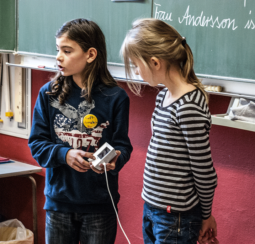 Die Aufstellung der Luftgüte-Litfaßsäule ist für die Viertklässler der Carl Humann-Schule indes noch nicht der ganze Erfolg. Sobald die Säule enthüllt war, schwärmten sie in Zweier-Teams in alle Klassen aus, um ihre Mission zu erfüllen. Ausgerüstet mit einem CO2-Messgerät und einer Liste von Fragen stellen sich die jungen „Luftforscher“, wie sie sich auf den mit Stolz getragenen Buttons nennen, vor die fremden Klassen und versuchen herauszubekommen, welches Bewusstsein über Luftqualität, Heizen und Lüften bei Schülern und Lehrkräften vorhanden ist. Und das ist durchaus unterschiedlich. Während die „Luftforscher“ in manchen Klassen nicht einmal darauf hinweisen müssen, dass es sinnvoll ist, während der Lüftungspausen auch die Heizkörper abzudrehen, stehen in anderen Klassen bei voller Beheizung ständige einige Fenster auf Kippstellung, ohne dass ausweislich der CO2-Messung die Luftqualität wirklich im grünen Bereich läge. Aus diesem Grund stellen die „Luftforscher“ auch jeder der besuchten Klassen für ein oder zwei Wochen ein Messgerät zur Verfügung, mit dem eine objektive Kontrolle der Luftgüte möglich ist. Die Schüler der Projektgruppe erhoffen sich davon eine Sensibilisierung für das Thema. Bei einem zweiten Besuch ein oder zwei Wochen später wollen sie herausfinden, ob sie Erfolg hatten und sich das Lüftungsverhalten verändert hat.