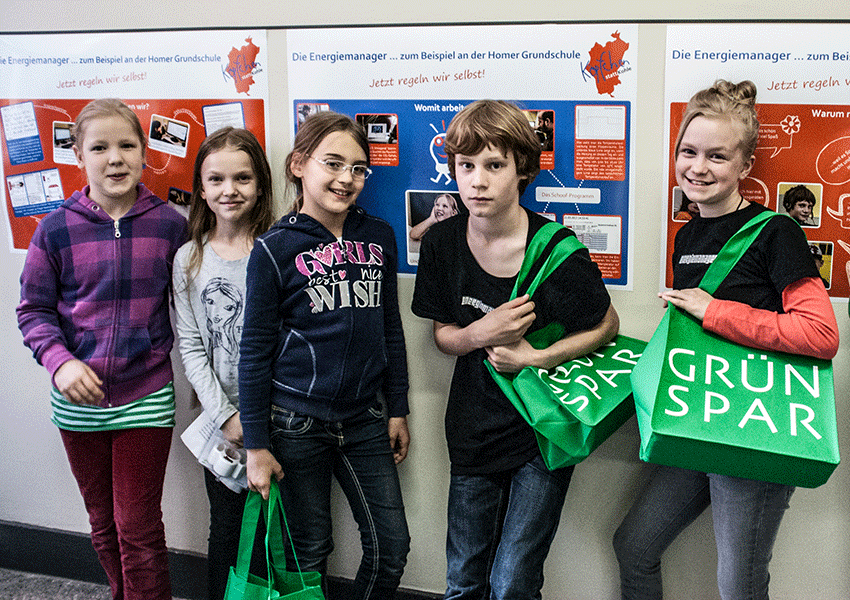 Die Auszeichnung als Gütesiegel-Schule ist nicht nur ideell. Mit dem Gütesiegel verbunden ist die Möglichkeit, aus den Mitteln des Berliner Schulanlagensanierungsprogramms einen Betrag in Höhe von bis zu 17.000 € zielgerichtet einzusetzen. Damit können Sanierungsmaßnahmen an der Schule finanziert werden, die nachweislich dem Klimaschutz dienen. Die Vorschläge dafür müssen von der Schule selbst kommen. Sicher werden sich auch die im „Köpfchen statt Kohle“-Projekt engagierten Dritt- bis Sechstklässler dazu etwas einfallen lassen und ihre Ideen mit Schulleiter Uwe Blachnik diskutieren, der die Arbeit der jungen Energiemanager schon bisher aktiv unterstützt hat. Unser Foto zeigt einige der Energiemanager der Homer-Grundschule vor einer selbst mitgestalteten Posterausstellung zu ihrem Projekt. Der Online-Shop für Energiesparprodukte „Grünspar“, dessen auffallende Taschen die Schüler hier präsentieren, unterstützt „Köpfchen statt Kohle“ mit Sachmitteln wie z.B. schaltbaren Steckdosen oder elektronischen Thermostatventilen.