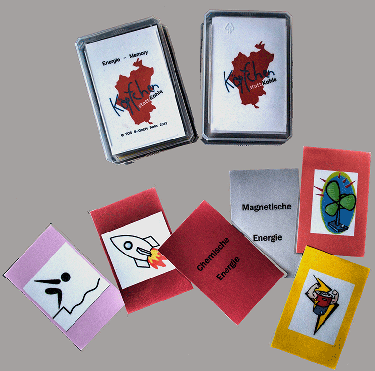 Aus der Projektarbeit von „Köpfchen statt Kohle“ entstehen auch Lernmaterialien, die die Energiebildung unterstützen. So hat die Schülerfirma der Tesla-Schule jetzt ein „Energie-Memory“ vorgestellt, mit dem die verschiedenen Energiearten spielerisch erarbeitet werden können. Ein weiteres Spiel, nämlich ein „Energie-Domino“ in Kartenform, wird von der Schülerfirma unter Leitung des Physiklehrers Peter Streckenbach zu Beginn des nächsten Schuljahres vorgestellt. Darin geht es vor allem um verschiedene Energieumwandlungen. Denn die Schülerinnen und Schüler sollen ein grundlegendes Verständnis davon bekommen, dass Energie eigentlich nicht „verbraucht“ werden kann, sondern immer nur umgewandelt und übertragen wird.