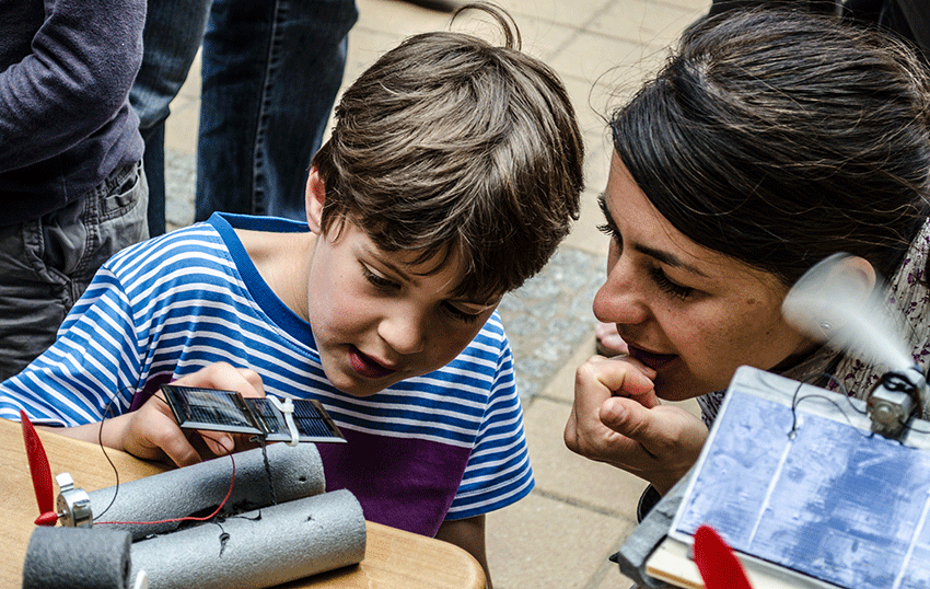 Unter den 20 teilnehmenden Schülern hat Schoolmann einige entdeckt, die sehr interessiert und eigenständig mitarbeiteten. Die möchte er gern für das „Köpfchen statt Kohle“-Projekt im neuen Schuljahr gewinnen. Die Vorstellung der gebauten Solarmodelle beim Schul-Sommerfest bot überdies die Chance, die Eltern zu informieren. Im Bild links erläutert ein stolzer Modellbauer seiner Mutter die Feinheiten der Konstruktion.