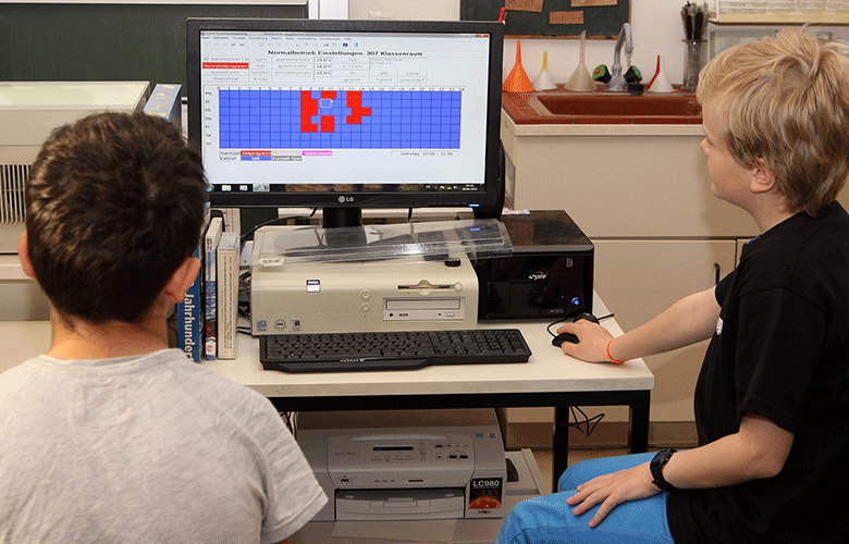 Beeindruckt war die Baustadträtin von dem ernsthaften Engagement, mit dem ihr die Schüler erläuterten, wie sie am Programm der Heizungssteuerung die bisher vorhandene „Blockbeheizung“ von Montag bis Freitag, 7 Uhr bis 18 Uhr, ausdünnen. Am Computerbildschirm demonstrierten die Energiemanager, wie das dann auch grafisch aussieht, wenn die roten Flächen, die für die Zeiten mit Wärmebedarf stehen, immer weniger werden und nur noch dann geheizt wird, wenn die Schüler wirklich in der Klasse sind. „So lernen die Kinder sehr praktisch und anschaulich, was Energieeffizienz bedeutet“, bekräftigte Claudia Kerns von der das Projekt betreuenden Agentur stratum den pädagogischen Effekt.