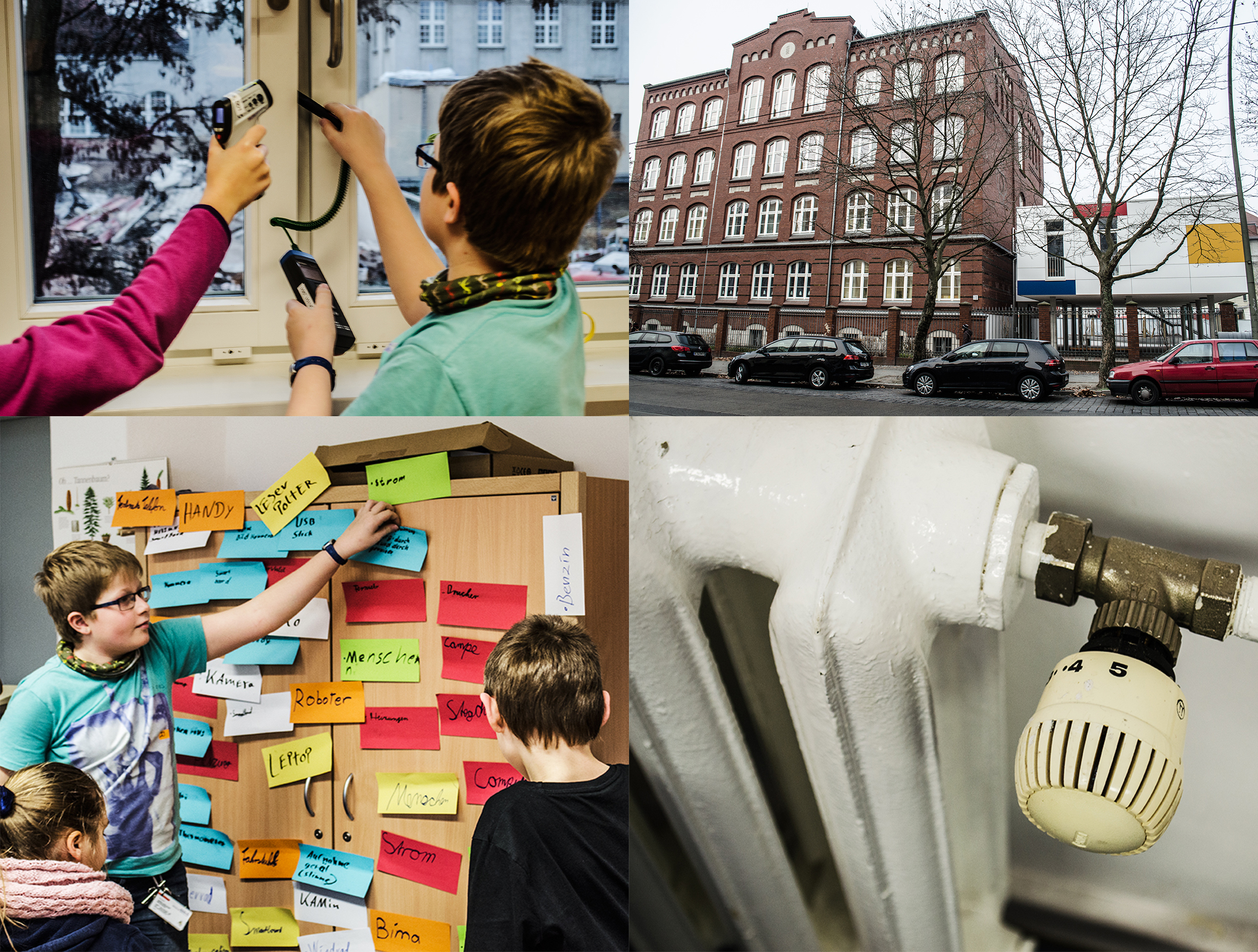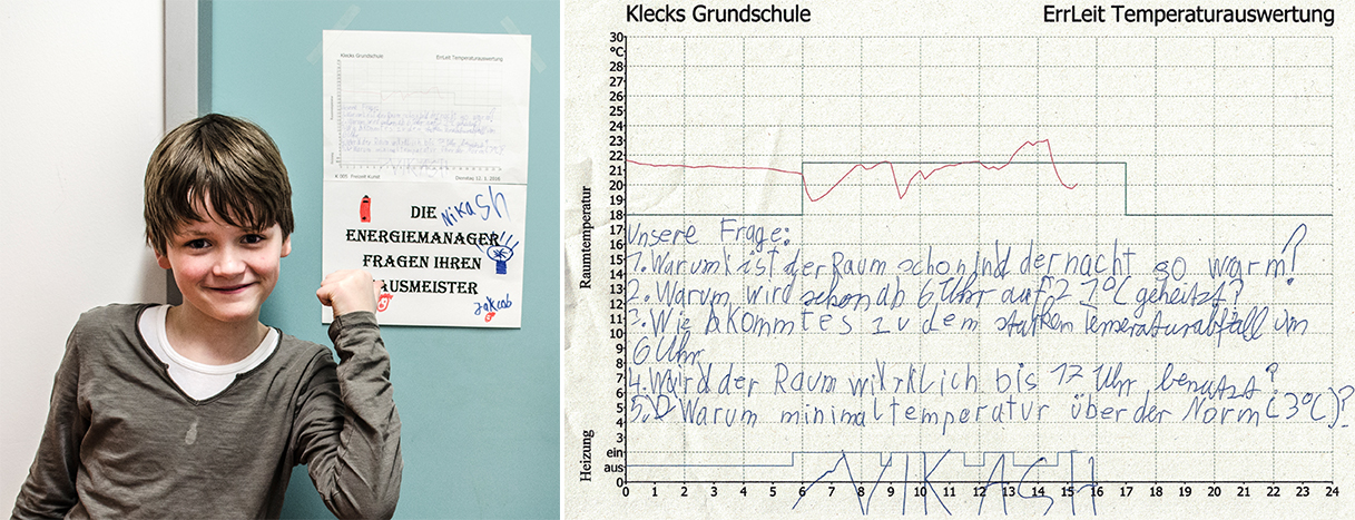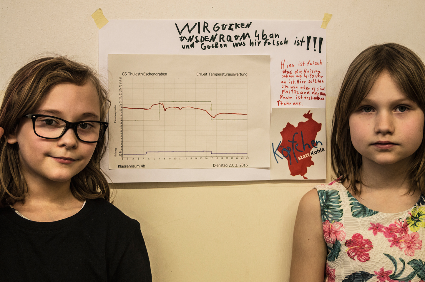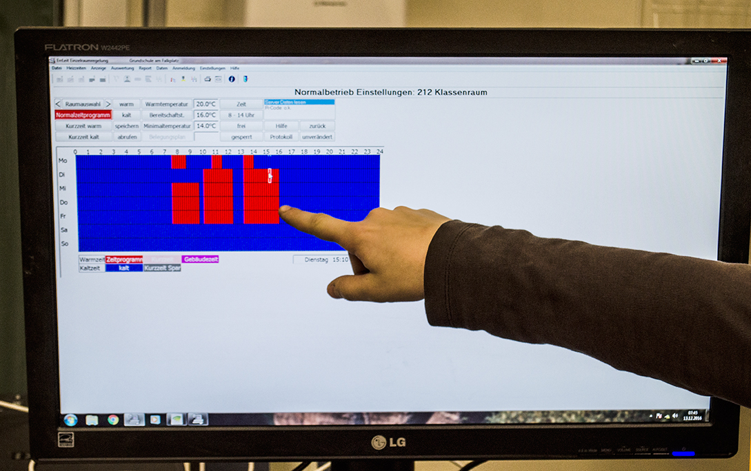 Zu den motiviertesten und aktivsten „Köpfchen statt Kohle“-Schulen gehört die Schule am Falkplatz. Hier treffen sich ein gutes Dutzend Fünft- und Sechstklässler jede Woche bereits um sieben Uhr morgens, um eine der größten Grundschulen Berlins energetisch zu verbessern. Unter anderem nutzen sie dazu einen eigenen Regelungszugang zur zentralen Heizungssteuerung am Computer. Hier können sie jeden Raum überwachen und auch korrigierend bei Temperaturen und Heizzeiten eingreifen – zumindest theoretisch.