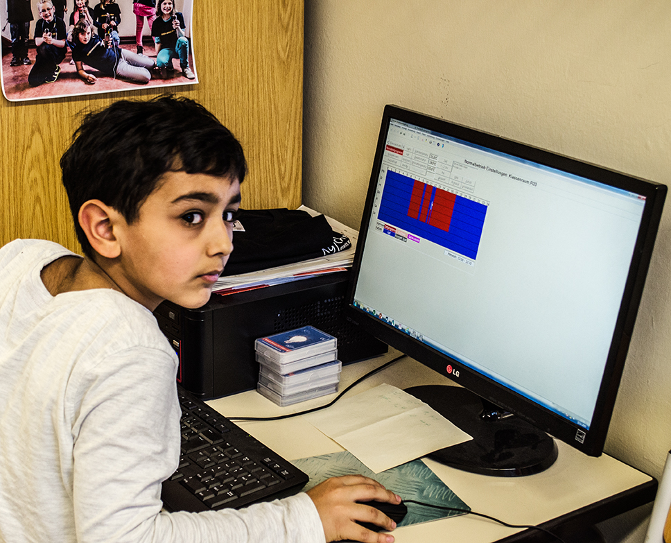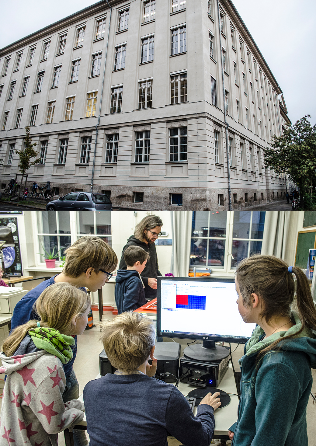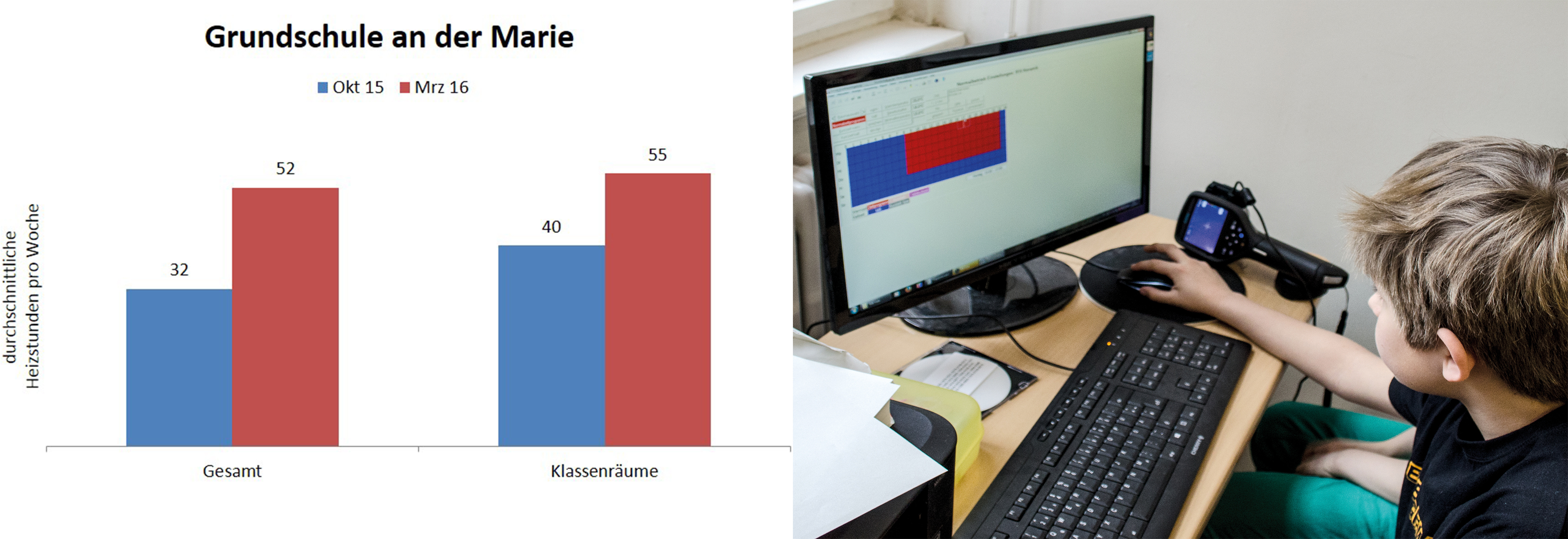 Zu den motiviertesten und aktivsten „Köpfchen statt Kohle“-Schulen gehört die Schule am Falkplatz. Hier treffen sich ein gutes Dutzend Fünft- und Sechstklässler jede Woche bereits um sieben Uhr morgens, um eine der größten Grundschulen Berlins energetisch zu verbessern. Unter anderem nutzen sie dazu einen eigenen Regelungszugang zur zentralen Heizungssteuerung am Computer. Hier können sie jeden Raum überwachen und auch korrigierend bei Temperaturen und Heizzeiten eingreifen – zumindest theoretisch.