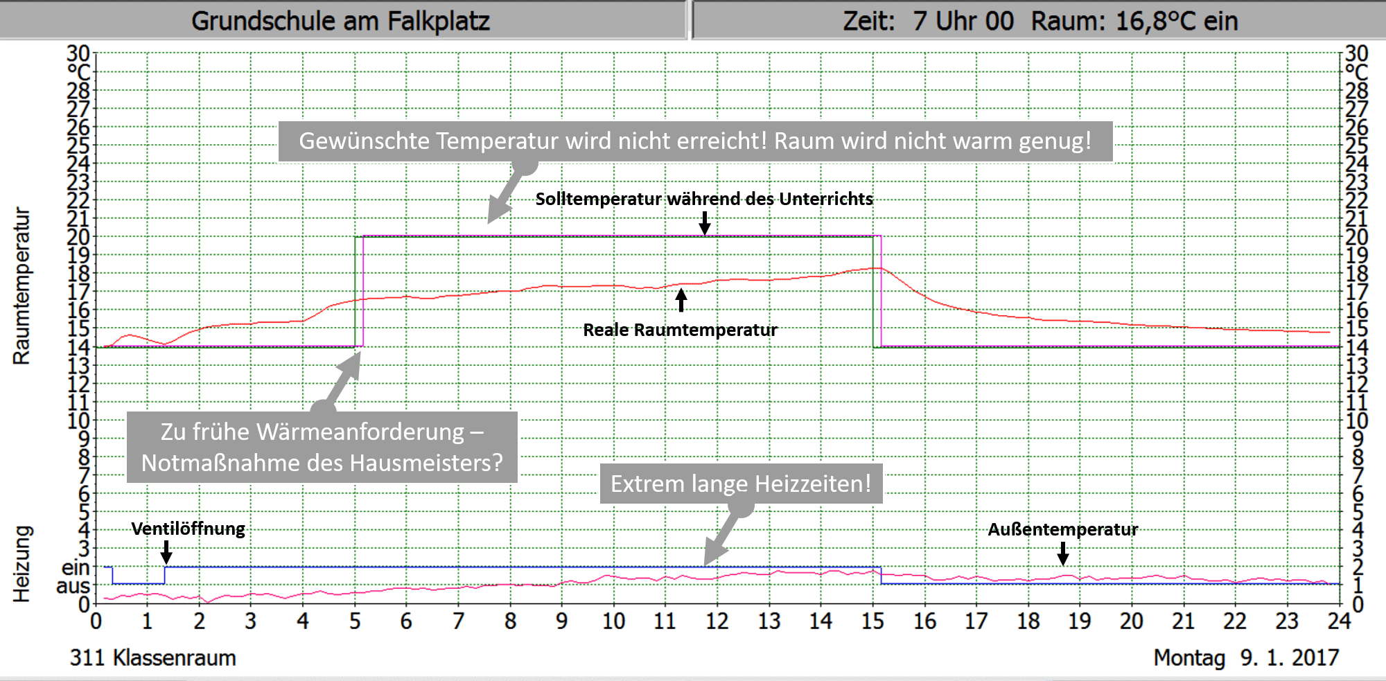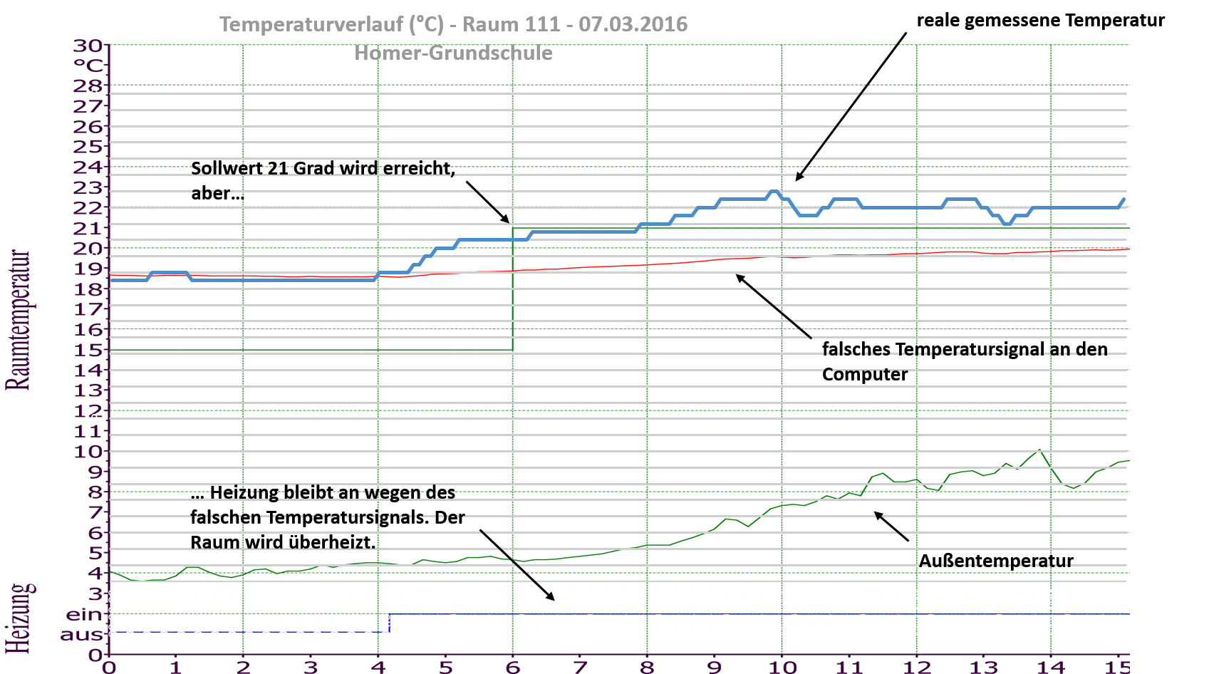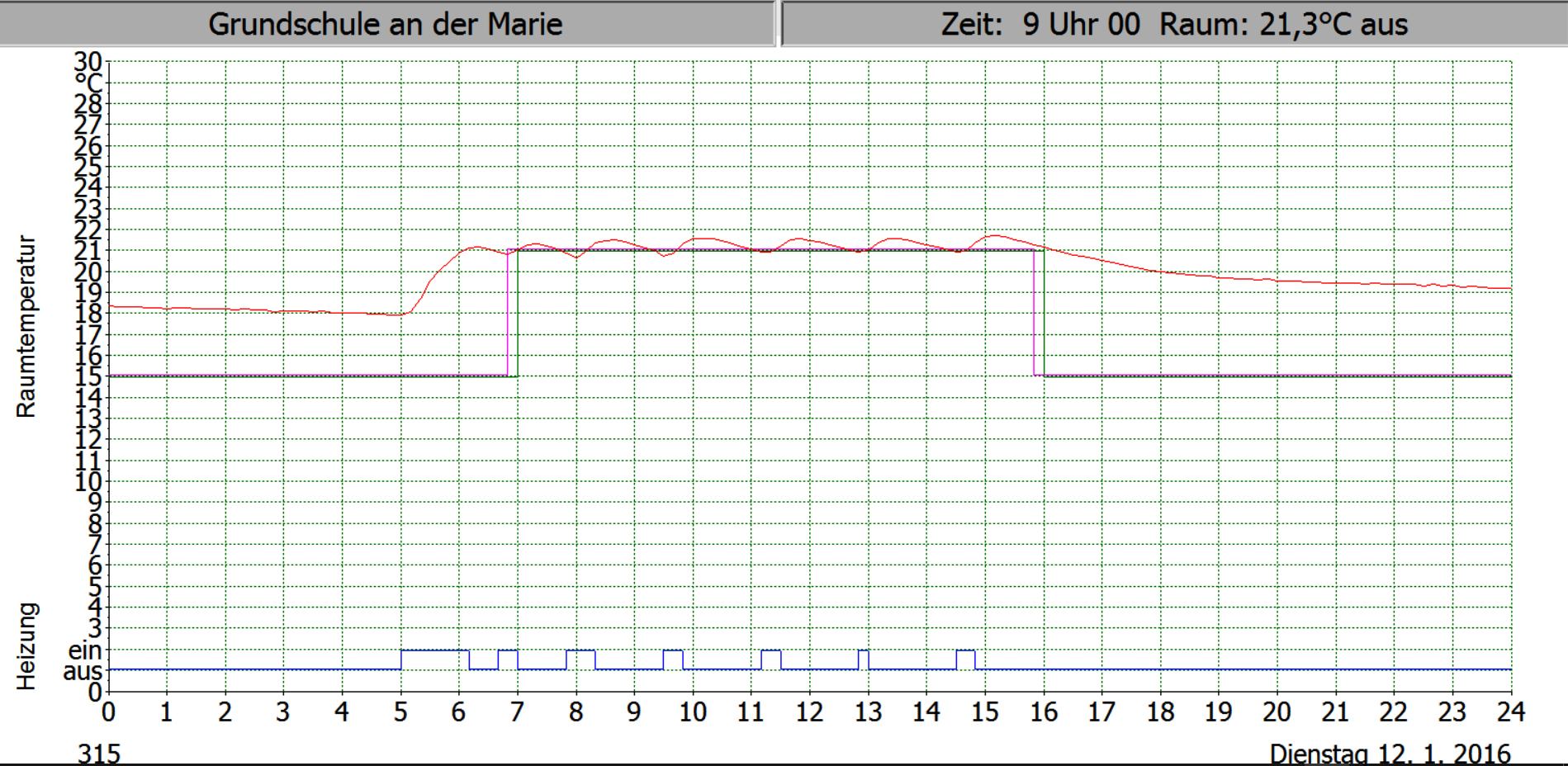 Die Energiemanager der Carl Humann-Schule waren im letzten Schuljahr sehr stolz darauf, dass sie die Ventilöffnungszeiten ihres Lebenskunde-Raumes signifikant senken konnten, ohne dass es dadurch im Raum kälter geworden wäre. Sie haben dafür nur den Aufstellort des Temperaturfühlers verändern müssen – weg aus der kalten Fensternische. Dieser ganze Erfolg ist jetzt zunichtegemacht. Die Auswertung der aktuellen Heizkurven (siehe Bild unten) zeigt, dass 14 Stunden lang geheizt werden muss, um während des Unterrichts halbwegs verträgliche Temperaturen zwischen 18 und 20 Grad zu haben. Den Glauben an Technik und Heizungssteuerung dürften die Fünftklässler dadurch allmählich verlieren.