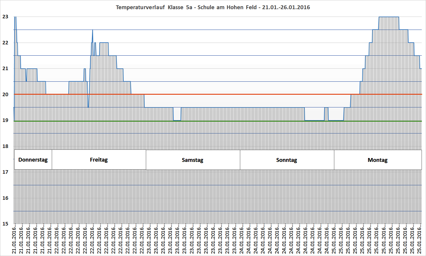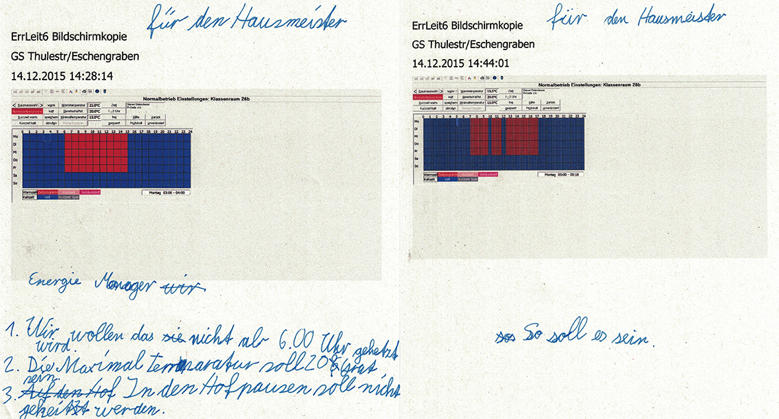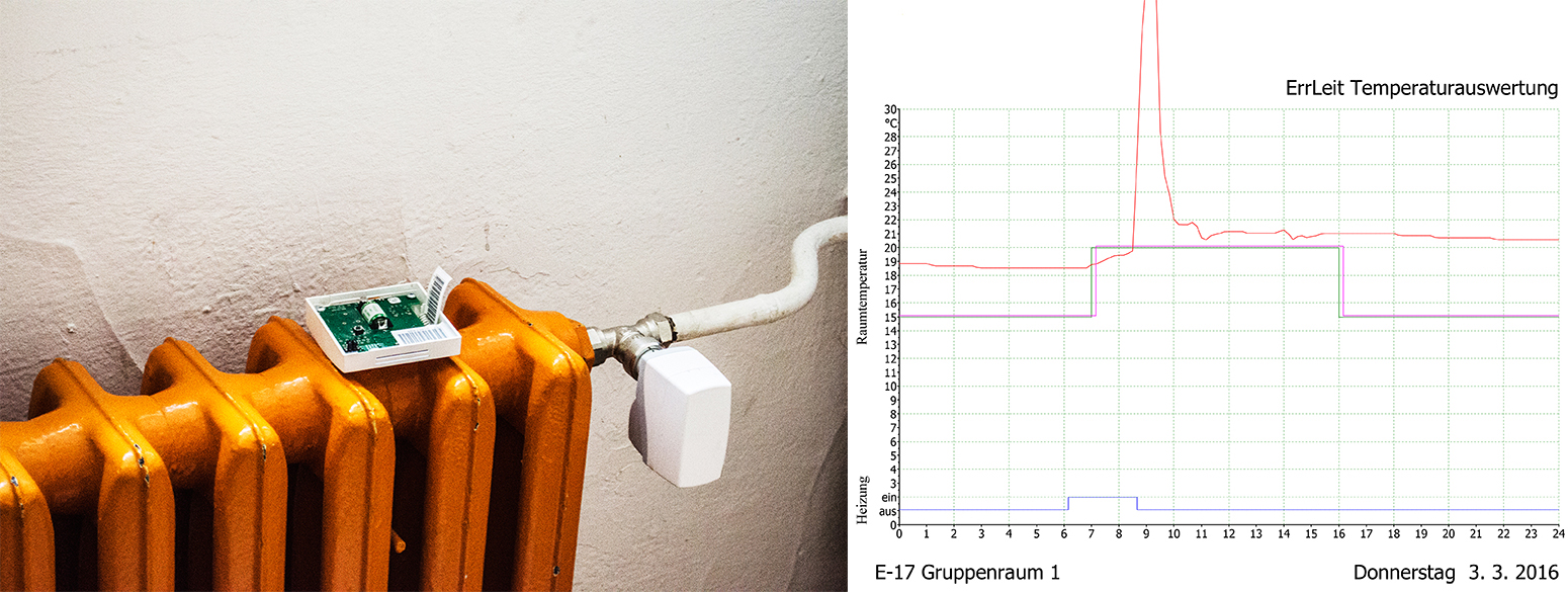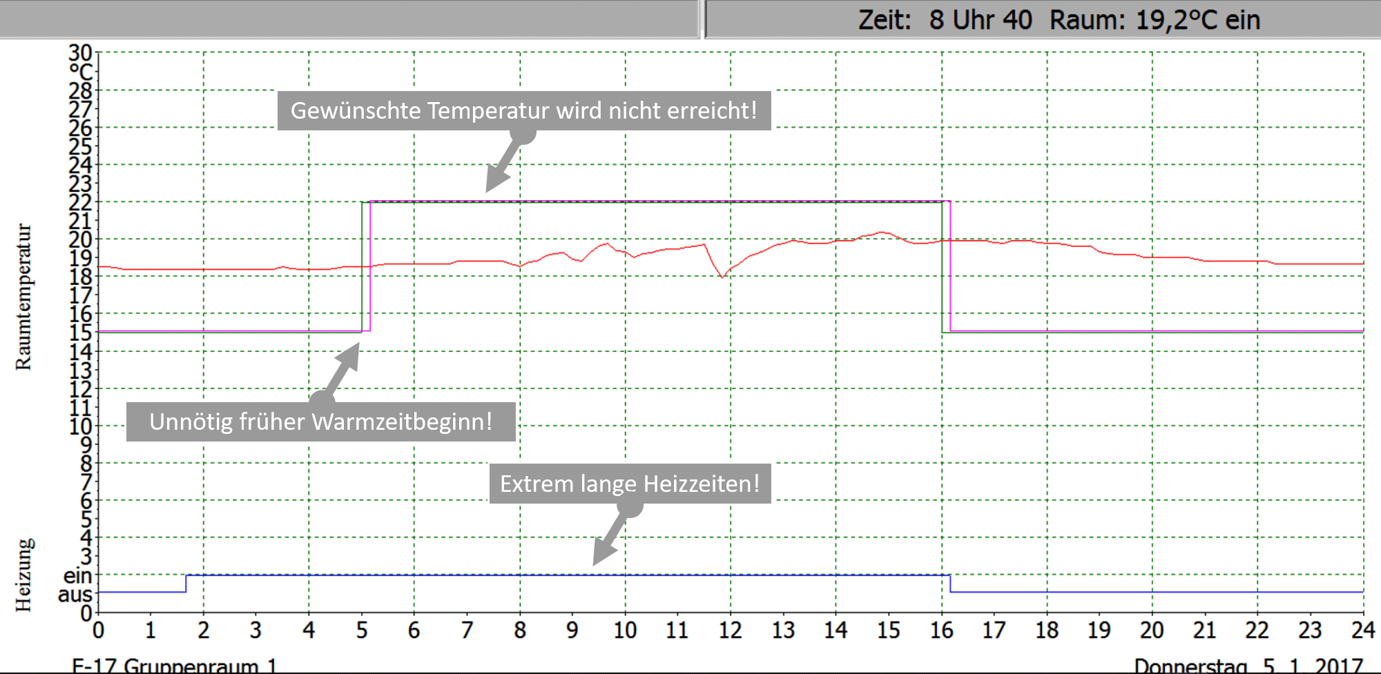 Die Energiemanager der Carl Humann-Schule waren im letzten Schuljahr sehr stolz darauf, dass sie die Ventilöffnungszeiten ihres Lebenskunde-Raumes signifikant senken konnten, ohne dass es dadurch im Raum kälter geworden wäre. Sie haben dafür nur den Aufstellort des Temperaturfühlers verändern müssen – weg aus der kalten Fensternische. Dieser ganze Erfolg ist jetzt zunichtegemacht. Die Auswertung der aktuellen Heizkurven (siehe Bild unten) zeigt, dass 14 Stunden lang geheizt werden muss, um während des Unterrichts halbwegs verträgliche Temperaturen zwischen 18 und 20 Grad zu haben. Den Glauben an Technik und Heizungssteuerung dürften die Fünftklässler dadurch allmählich verlieren.