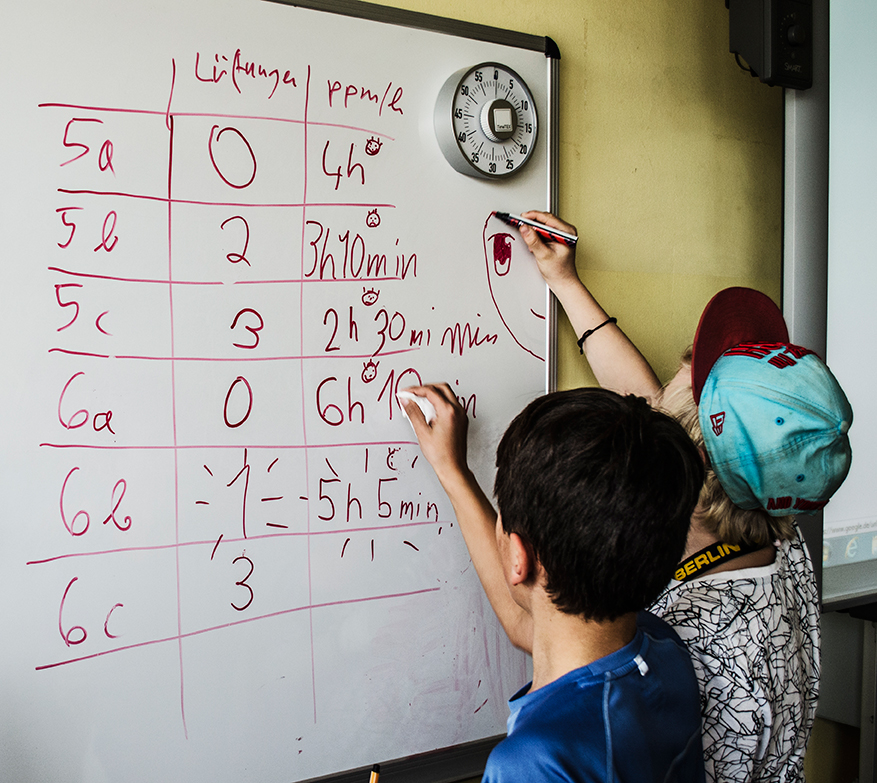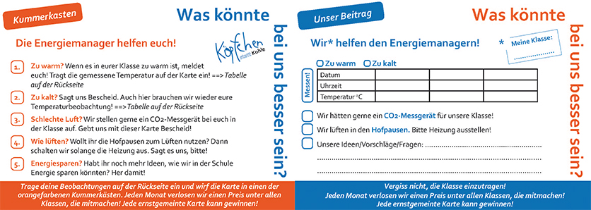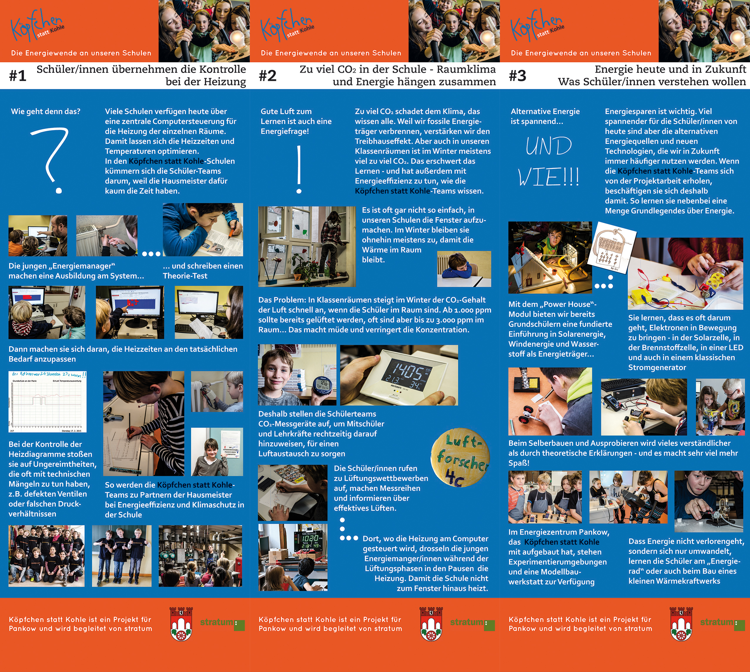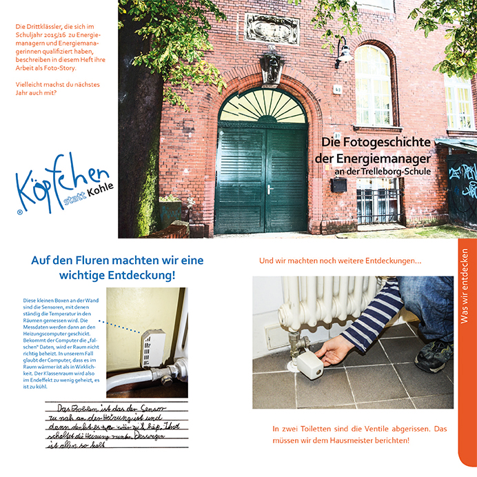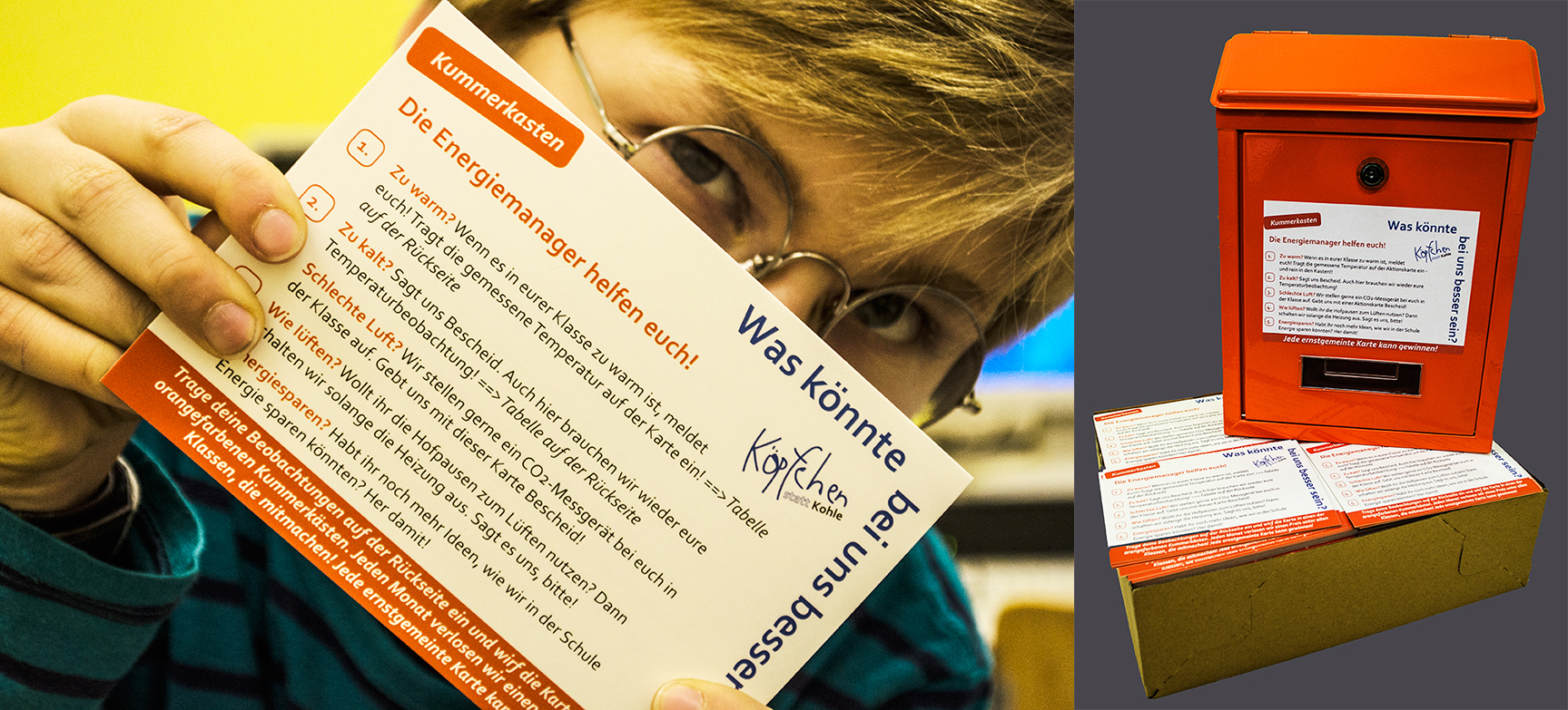 „Köpfchen statt Kohle“-Projekte sehen an jeder Schule etwas anders aus. Das liegt nicht nur an den einzelnen Schülern, die mitarbeiten, oder den Bedingungen der jeweiligen Gebäude und Energietechnik, sondern auch an den verschiedenen Organisationsformen der Projekte. Die jungen Energiemanager sind zum Teil in Profil- und Schwerpunktkursen aktiv, also im Rahmen des Wahlpflichtunterrichts, zum großen Teil jedoch auch in freien Arbeitsgemeinschaften oder im Rahmen von Hort- und Schülerclubangeboten. An manchen Schulen werden aus allen Klassen bestimmter Jahrgangsstufen jeweils ein oder zwei Schüler/innen in die Energieprojektgruppe abgeordnet, meistens aber kommen die, die einfach auf das Thema „Energie“ Lust haben. Während in der Hälfte der „Köpfchen statt Kohle“-Schulen Lehrkräfte die Gruppe mit betreuen, sind es in der anderen Hälfte die externen Projektbetreuer von „Köpfchen statt Kohle“ ganz alleine, die die Arbeit mit den Schülern übernehmen.