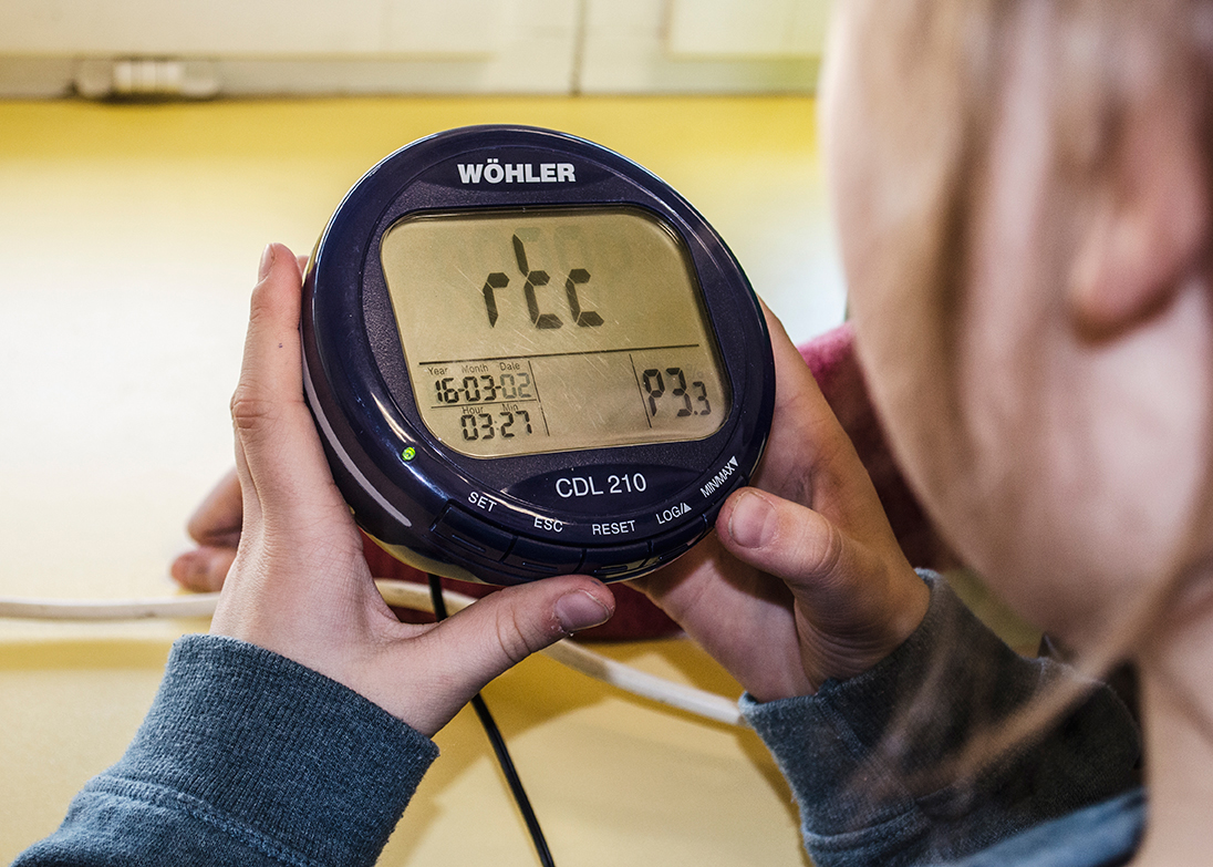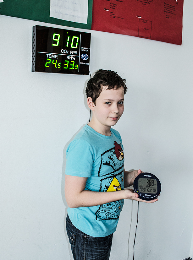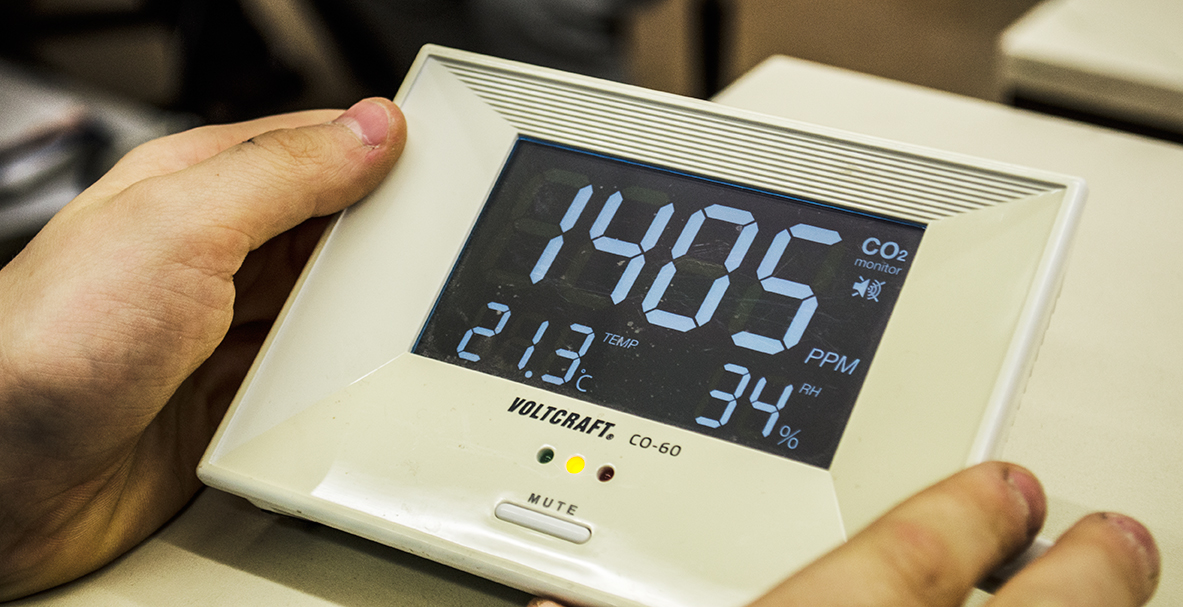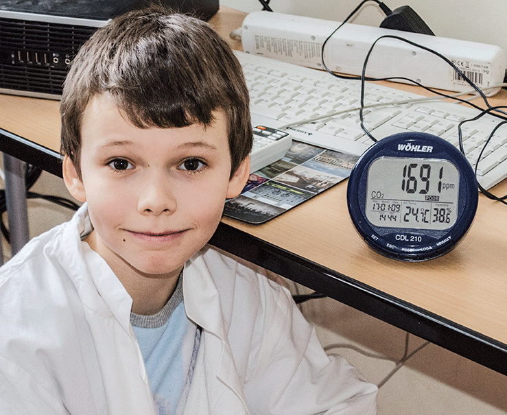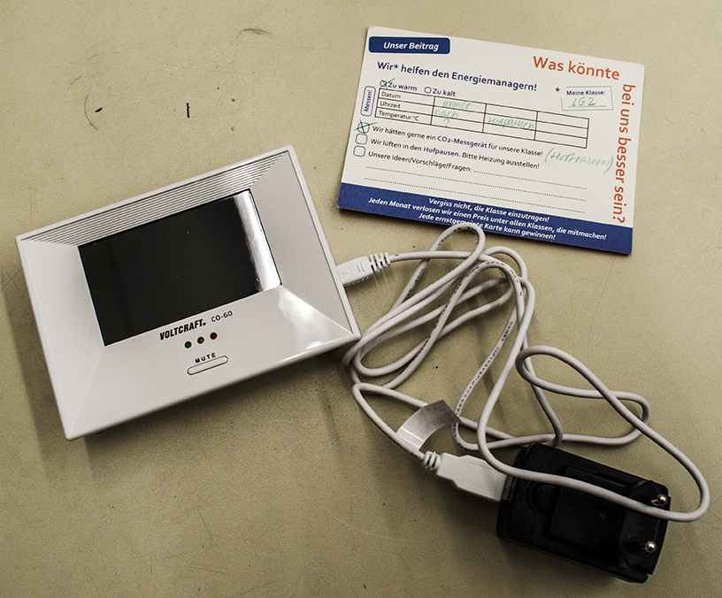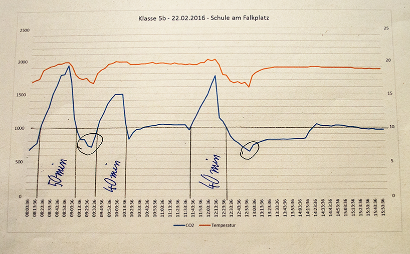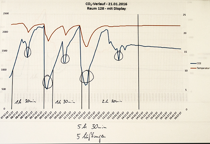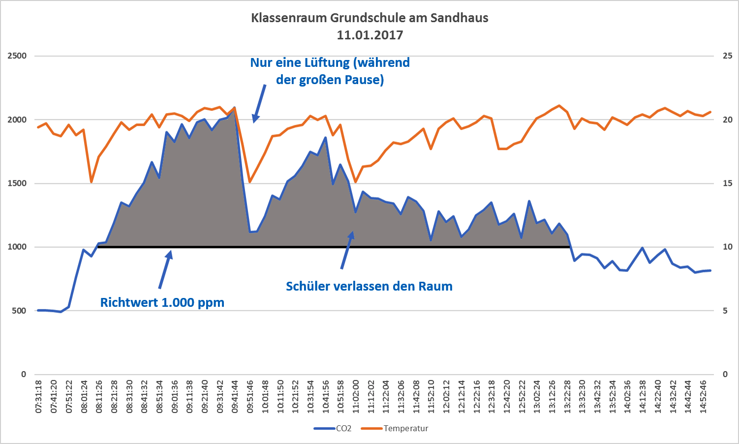 Ein Problem, das mit Technik alleine nicht zu lösen ist, liegt in der schlechten Luftqualität in den Schulen während des Winterhalbjahres. Die Kohlendioxid-Werte in einem Klassenraum steigen mit Unterrichtsbeginn rasch über den Richtwert von 1.000 ppm. Ohne aktives und effektives Lüften kann er nicht gesenkt werden. Wie die Energiemanager der Grundschule am Sandhaus jetzt durch Messaufzeichnungen herausfanden, besteht ein erhöhter CO2-Wert in vielen Klassenräumen den ganzen Unterrichtstag lang. Zu viel CO2 führt zu Müdigkeit und Konzentrationsschwächen, ist also ein Lernhindernis. Einmaliges Lüften in der großen Pause reicht nicht aus, um ein lernfreundliches Klassenraum-Klima herzustellen, wie untenstehende Beispielauswertung aus der Sandhaus-Schule zeigt.