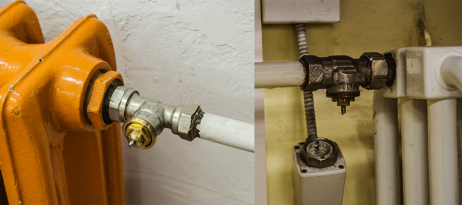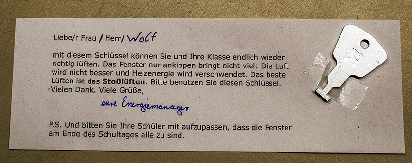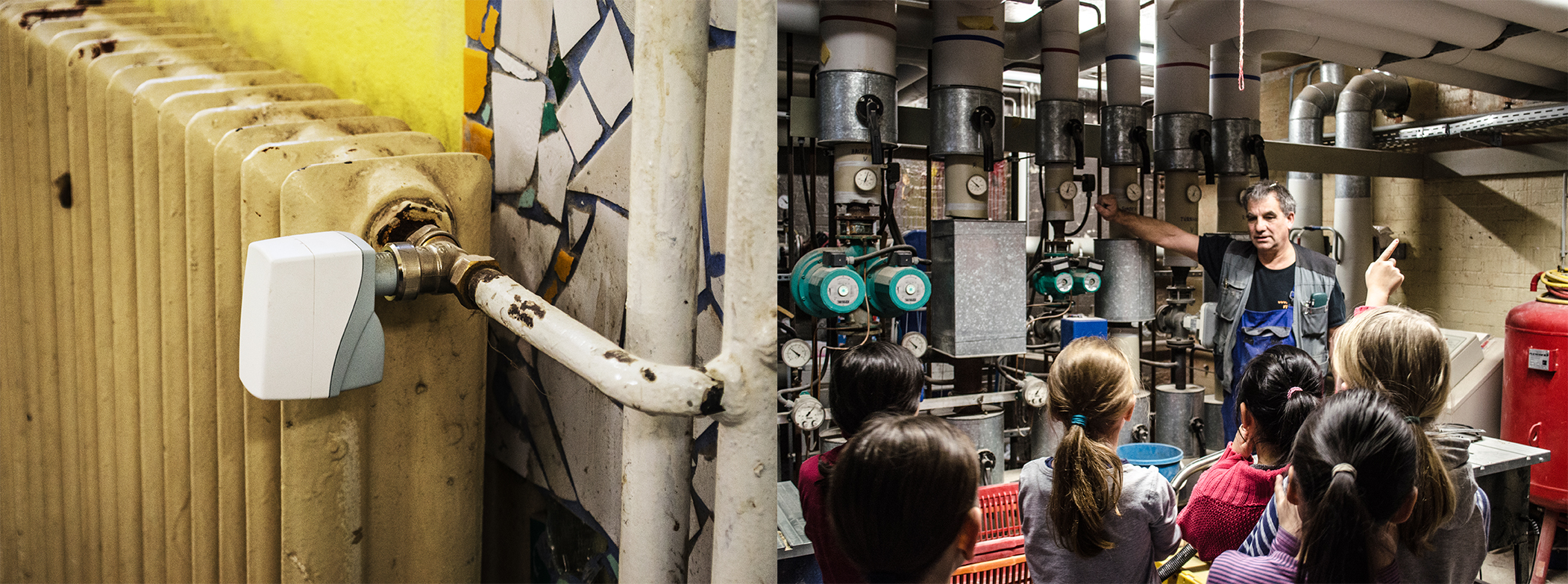 Nicht nur die Falkplatzschüler verlieren zuweilen den Glauben an die Technik. In mindestens zwei anderen Schulen, in denen die Heizung ebenfalls für alle Räume gezielt und individuell am Computer gesteuert werden kann, um Energieeffizienz sicherzustellen, beobachten die jungen Energiemanager, dass die Hausmeister die Steuerungsthermostate von den Heizkörpern abschrauben. Dadurch sind die Ventile ständig maximal geöffnet und die Räume werden dauernd beheizt. Anscheinend wissen sich manche Hausmeister nicht mehr anders zu helfen, um die Schule warm zu kriegen. Das sieht dann so aus wie in der Carl Humann-Schule (linkes Bild) oder der Grundschule unter den Bäumen (rechts):