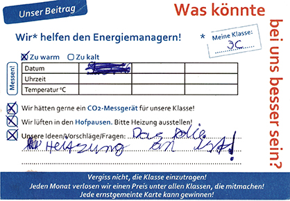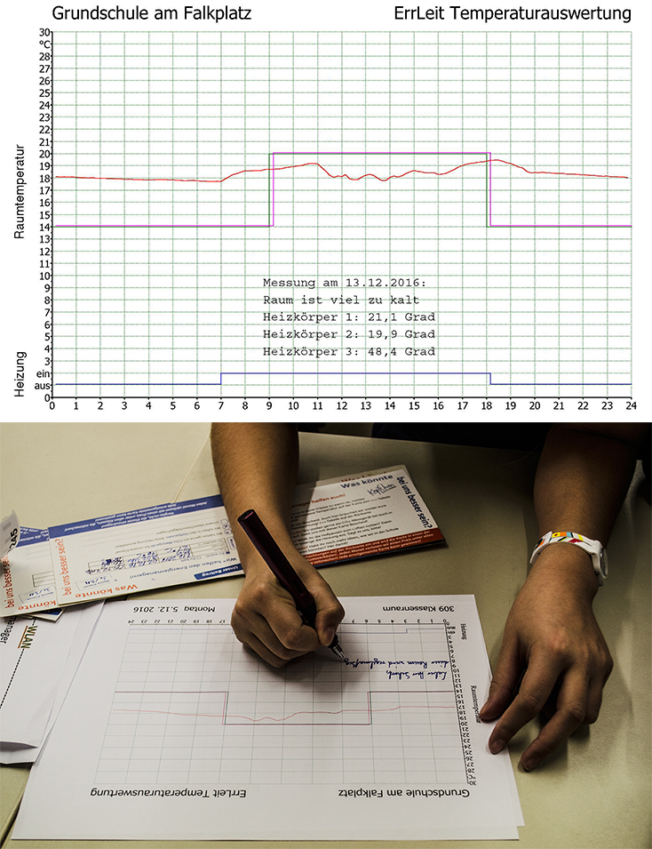 Denn in letzter Zeit bekommen die jungen Energiemanager immer öfter den Eindruck, dass vieles gar nicht mehr regelbar ist im System. In etlichen Räumen ihrer Schule werden die eingestellten Solltemperaturen nicht erreicht, in anderen Räumen sinkt die Temperatur nachts kaum ab. Besonders beschäftigt die Schülerinnen und Schüler derzeit der Umstand, dass sie sich statt mit ihrem Energiesparauftrag mit dem Gegenteil beschäftigen müssen – mit Klassenräumen, die zu kalt sind. Solche Räume finden die Energiemanager vor allem in der dritten Etage ihrer Schule. Um Hilfe zu bekommen, haben sie jetzt einen Brief an den Projektbeirat von „Köpfchen statt Kohle“ geschrieben (siehe Abbildung links), in dem Bauamt, Schulamt, Schulaufsicht und Techniker zusammenarbeiten. Ein sogenannter hydraulischer Abgleich der gesamten Heizanlage der Schule, der als Basis für eine regelbare Heizung notwendig ist, wurde den Schülern inzwischen vom Bezirksamt in Aussicht gestellt. Die untenstehende Grafik zeigt an einem Beispiel, was die Energiemanager bei der Auswertung von Messdaten eines unterbeheizten Raumes alles im Blick haben.