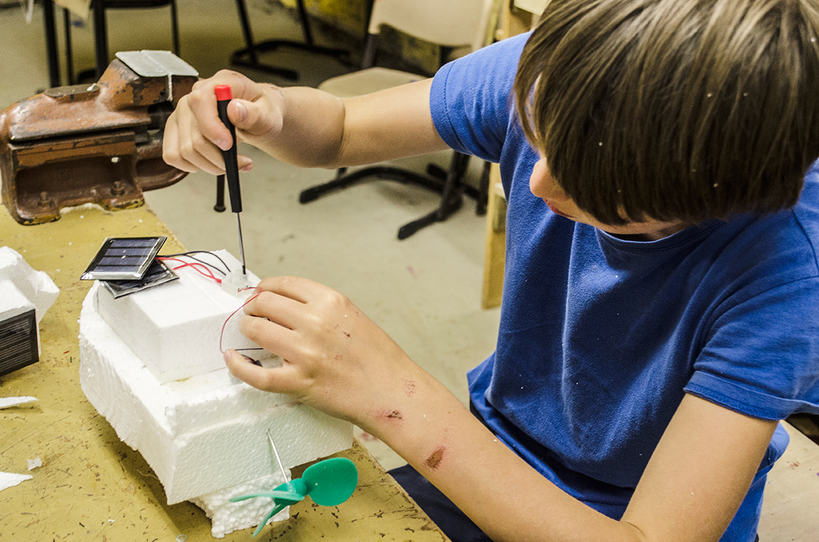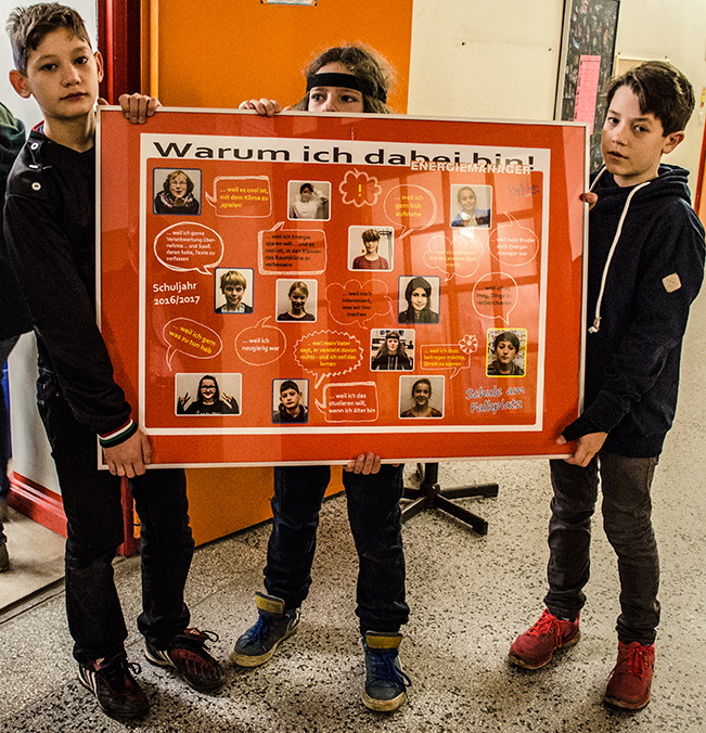 Grundschule am Sandhaus: Die Motivation, sich am Energieprojekt im neuen Schuljahr zu beteiligen, wird in der Grundschule am Sandhaus durch eine Serie aus drei DIN A1-Postern unterstützt, die im Schaukasten vor dem „Nawi“-Raum hängen. („Nawi“ heißen die gesammelten naturwissenschaftlichen Fächer an den Berliner Grundschulen.) Auf den Postern sind die Experimente der Schüler aus dem letzten Jahr erläutert, die sich um die verschiedenen Energiearten und vor allem um erneuerbare Energien drehten. Natürlich ist es am spannendsten, erst einmal zu entdecken, wen der abgebildeten Schüler/innen man kennt – oder ob man gar selbst auf den Postern mit drauf ist.