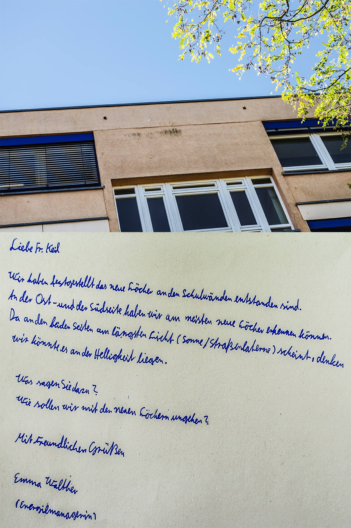 Vor einer echten Herausforderung stehen auch die Energiedetektive der Grundschule unter den Bäumen in Berlin-Blankenburg. Nachdem der Vorgänger-Jahrgang sich erfolgreich dafür eingesetzt hatte, dass die durch zahlreiche Spechtlöcher beschädigte Wärmedämmung der beiden Giebelseiten ihrer Schule ausgebessert und zur Prophylaxe mit zahlreichen Nistkästen an der Hauswand ausgestattet wurde, ergab eine Inspektion zu Beginn des neuen Schuljahres einen sonderbaren Befund: Während an der nördlichen Giebelseite alles in Ordnung ist, sind an der südlichen Front doch wieder neue Spechtlöcher entstanden, die die Wärmedämmung des Gebäudes beeinträchtigen. Die knapp 20 Fünft- und Sechstklässler, die in der Energie-Projektgruppe in diesem Schuljahr mitarbeiten, wollen jetzt erst einmal herausfinden, was der Grund für diese ungleiche Situation sein kann. Sie sammeln derzeit Hypothesen und suchen nach Messdaten, die einen Unterschied begründen. Auch Experten wollen sie fragen – und natürlich die Situation weiter beobachten. Auch hier haben die Schüler also mit einem Problem zu tun, für das kein Schulbuch die Lösung enthält!