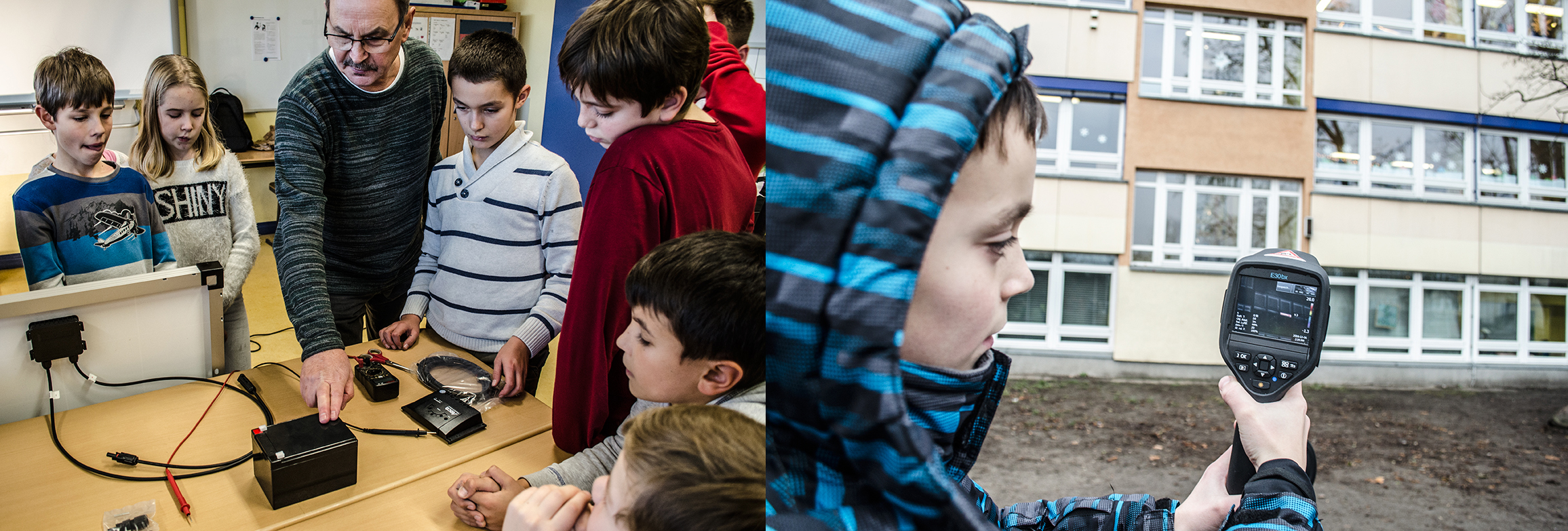 Am Robert Havemann-Gymnasium werden derzeit die ersten „Junior-Energieberater“ ausgebildet. Die Schüler aus den Klassenstufen 7 bis 12 werden im Juli die Theorie- und Praxisprüfung absolvieren, um danach sowohl im privaten wie im öffentlichen Bereich tätig zu werden. Ihre Aufgabe ist es, in kurzer Zeit und ohne hohe Kosten wesentliche Ansatzpunkte für Energie- und Ressourceneinsparung bei Beleuchtung, Heizung, Elektrogeräten und Wasserverbrauch zu finden. U.a. sind sie auch mit einer handlichen Wärmebildkamera ausgerüstet (siehe Foto oben). Das Berliner Wochenblatt berichtete über die „Junior-Energieberater“ in seiner ersten Ausgabe im neuen Jahr (Download im „Presse“-Bereich dieses Weblogs).